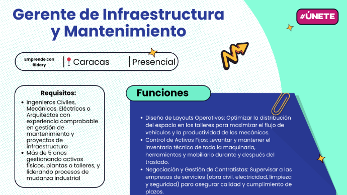 En Emprende con Ridery, trabajarás con equipos multidisciplinarios para construir el ecosistema que impulsa a los nuevos dueños de flotas en Venezuela. Somos el brazo ejecutor y tecnológico de una empresa en expansión indetenible, donde ofrecemos beneficios competitivos y la oportunidad de aprender junto a los líderes que están redefiniendo la movilidad y el servicio técnico.